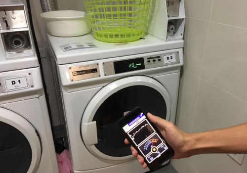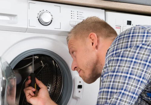 - Мастер проверяет работу стиральной машины после завершения ремонта.